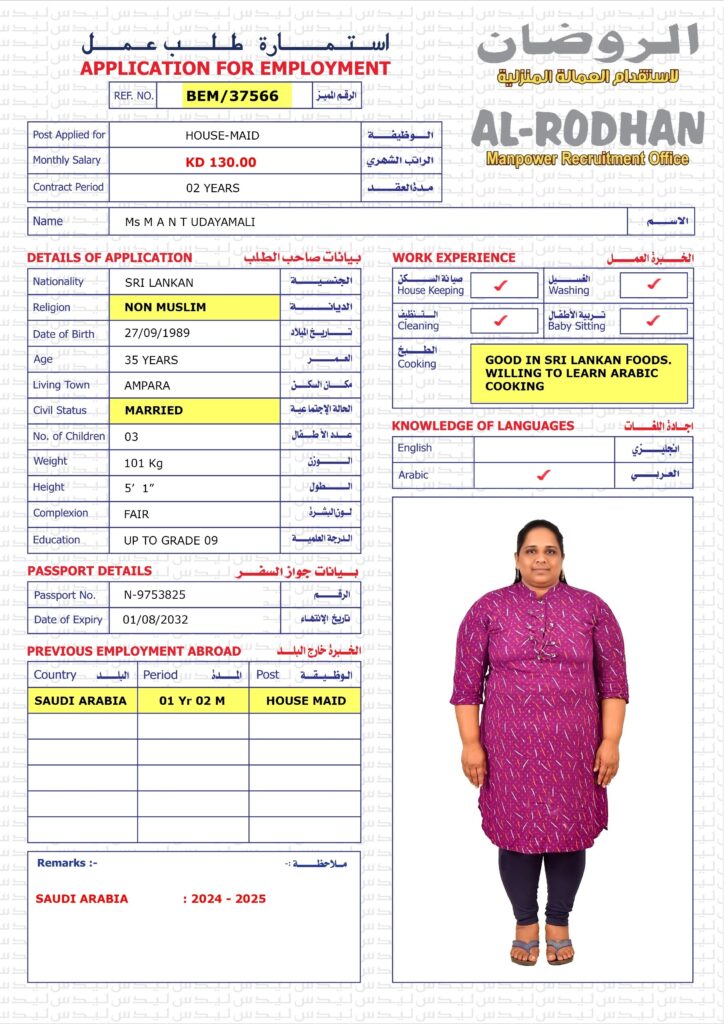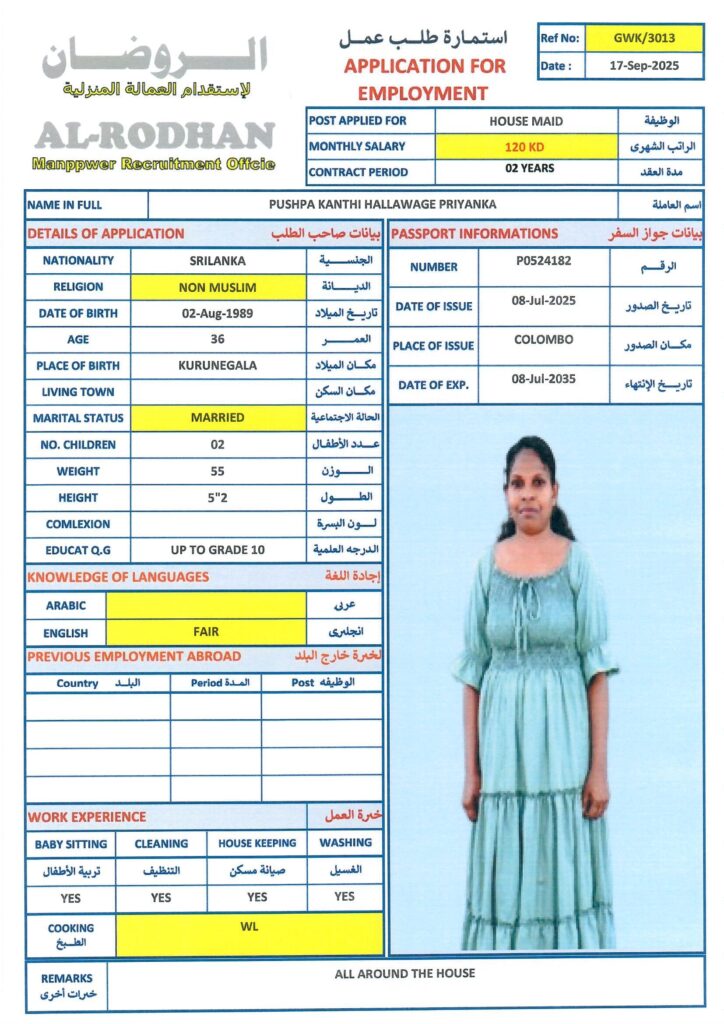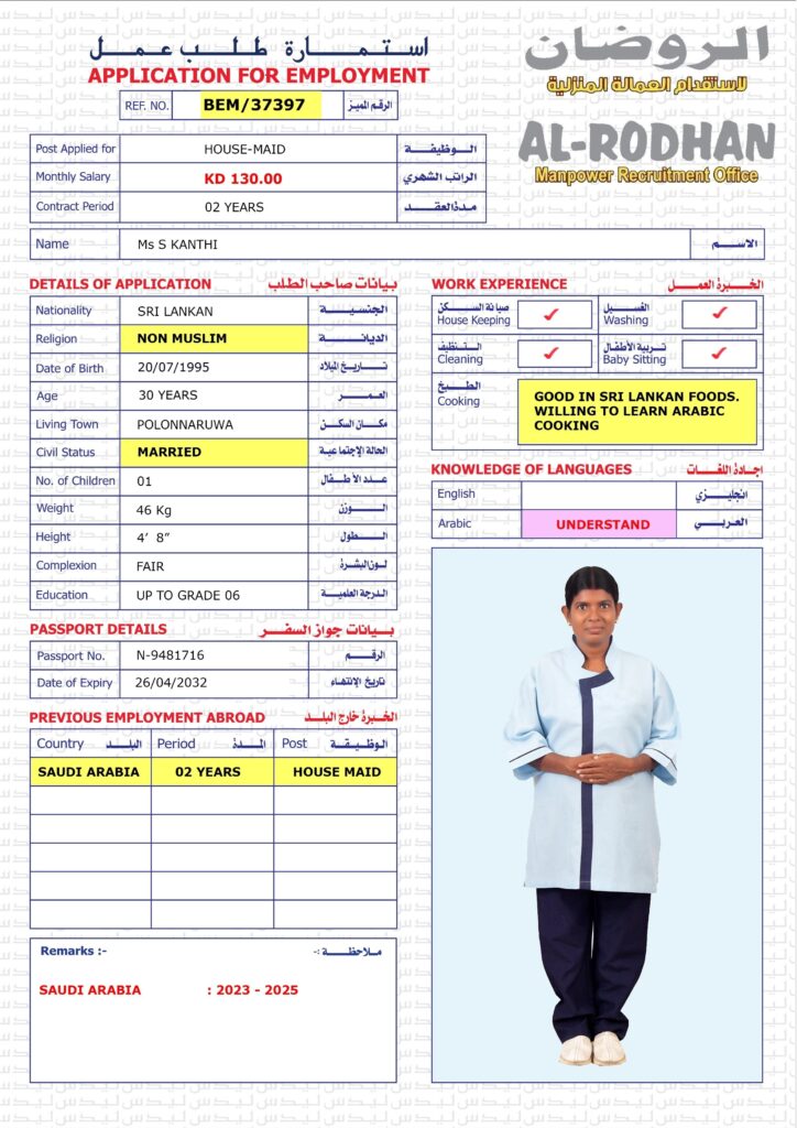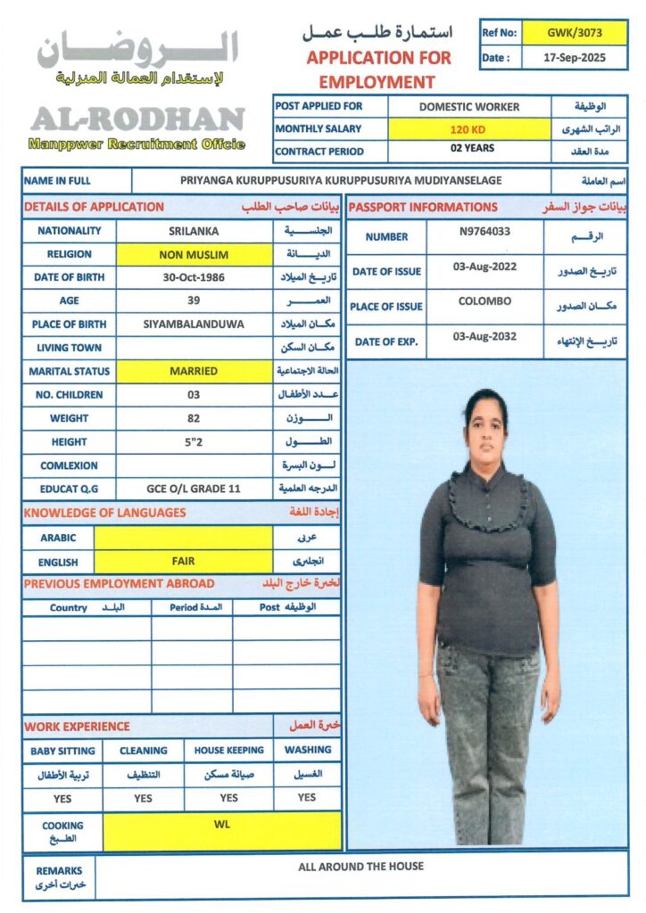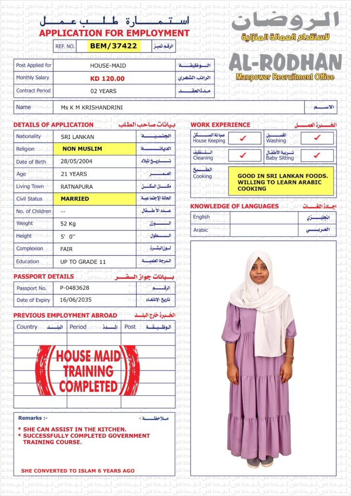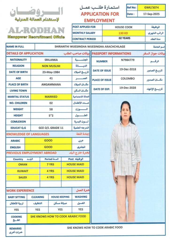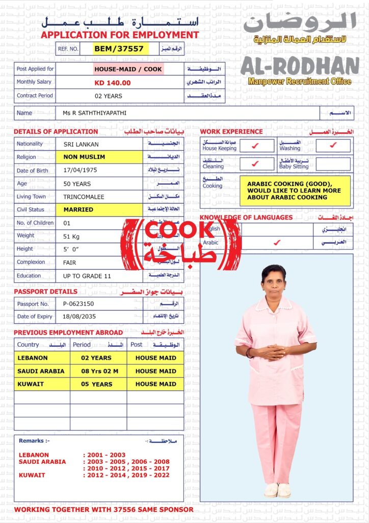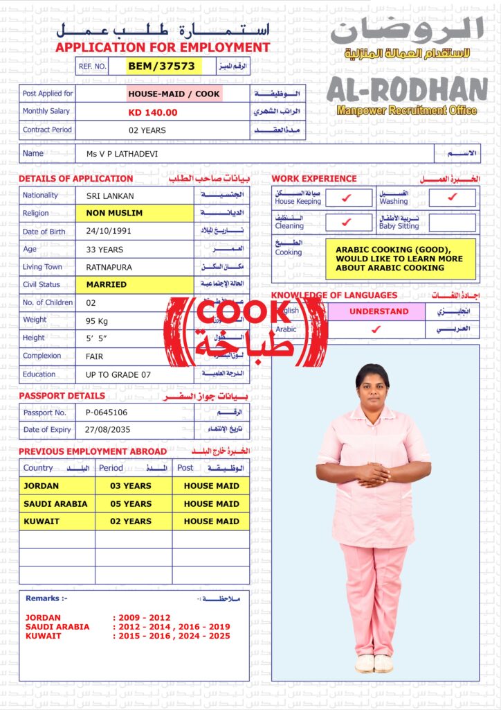 30-39, non-muslim, أنثى, التوفر, سيلان, طباخات, عاملة منزل, متوفر