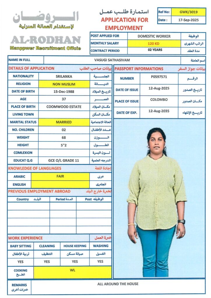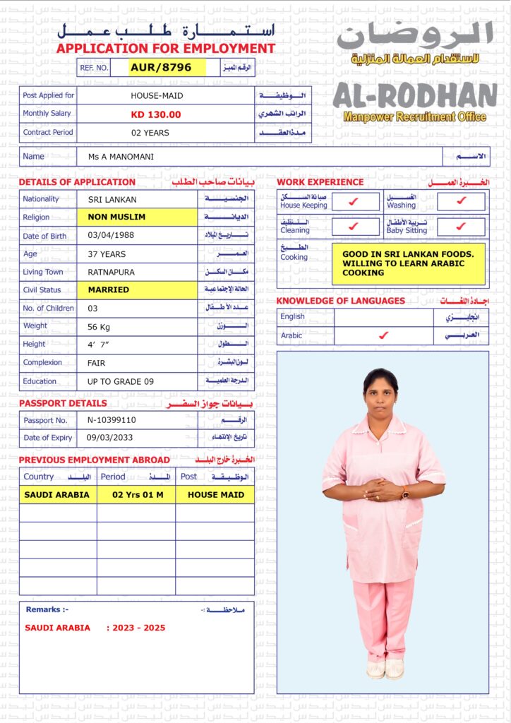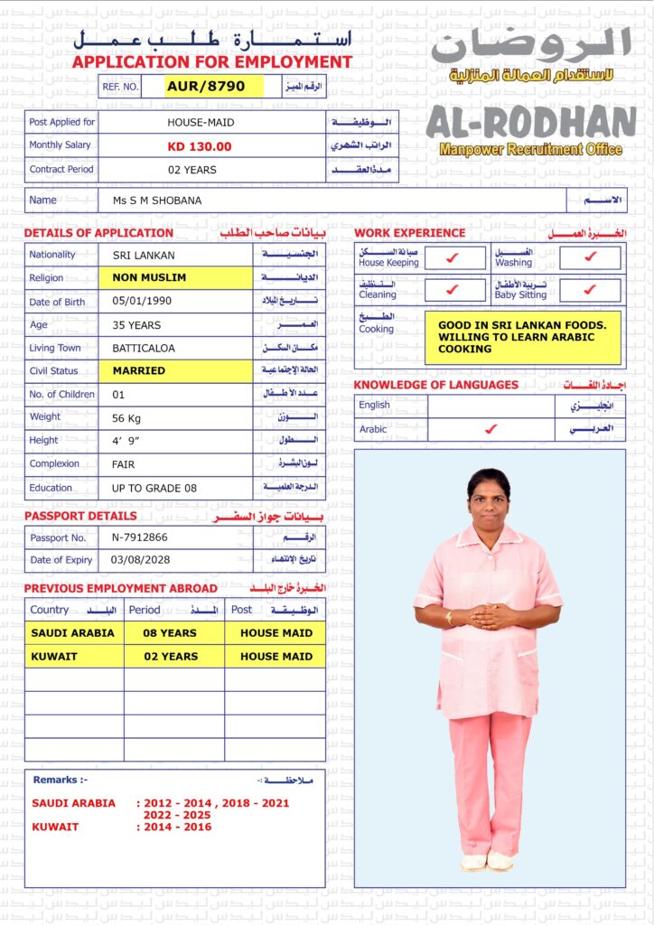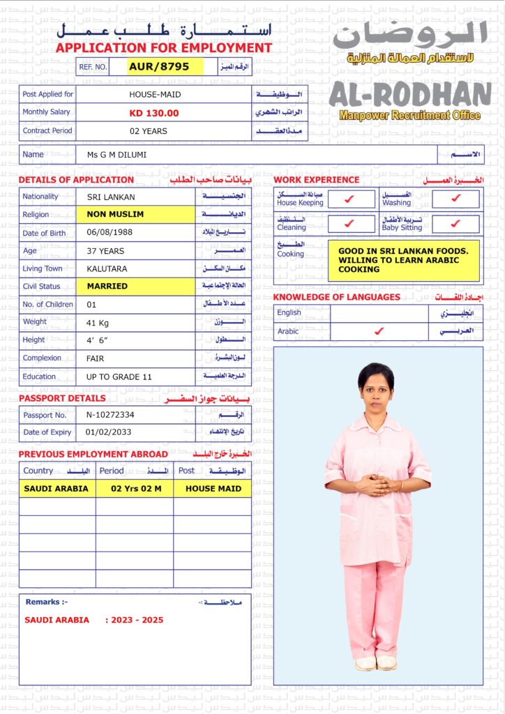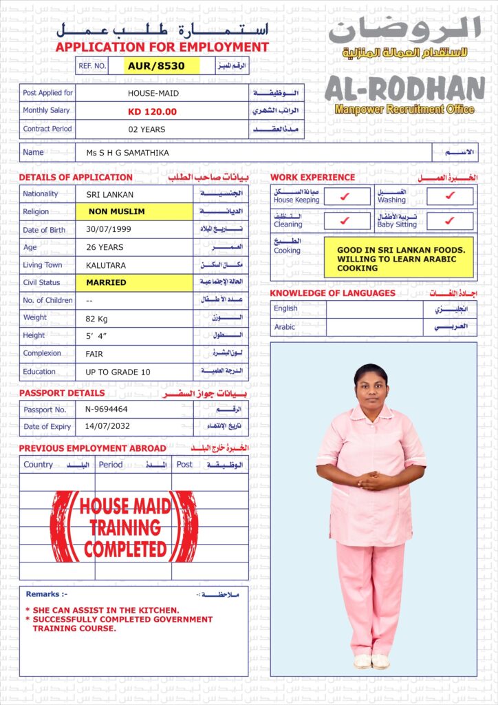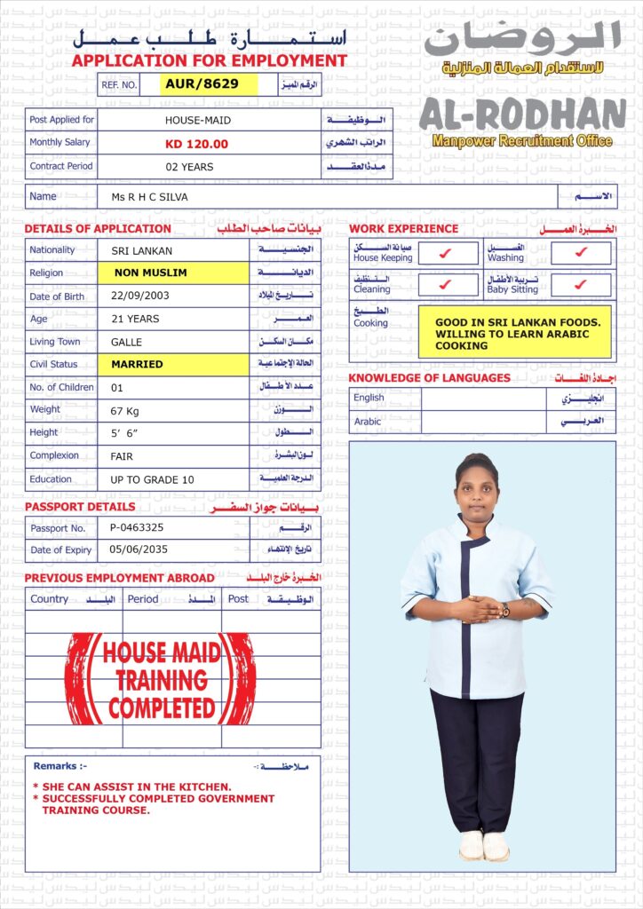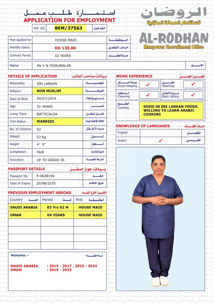 30-39, non-muslim, أنثى, التوفر, سيلان, طباخات, عاملة منزل, متوفر