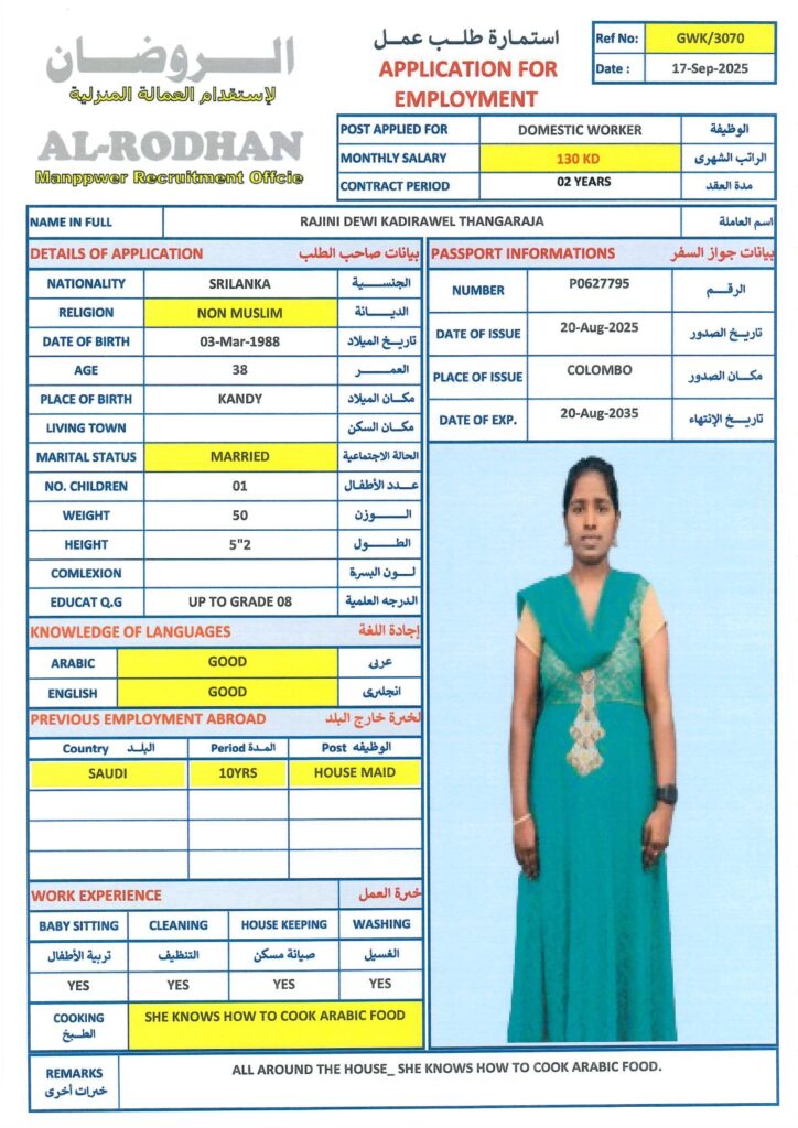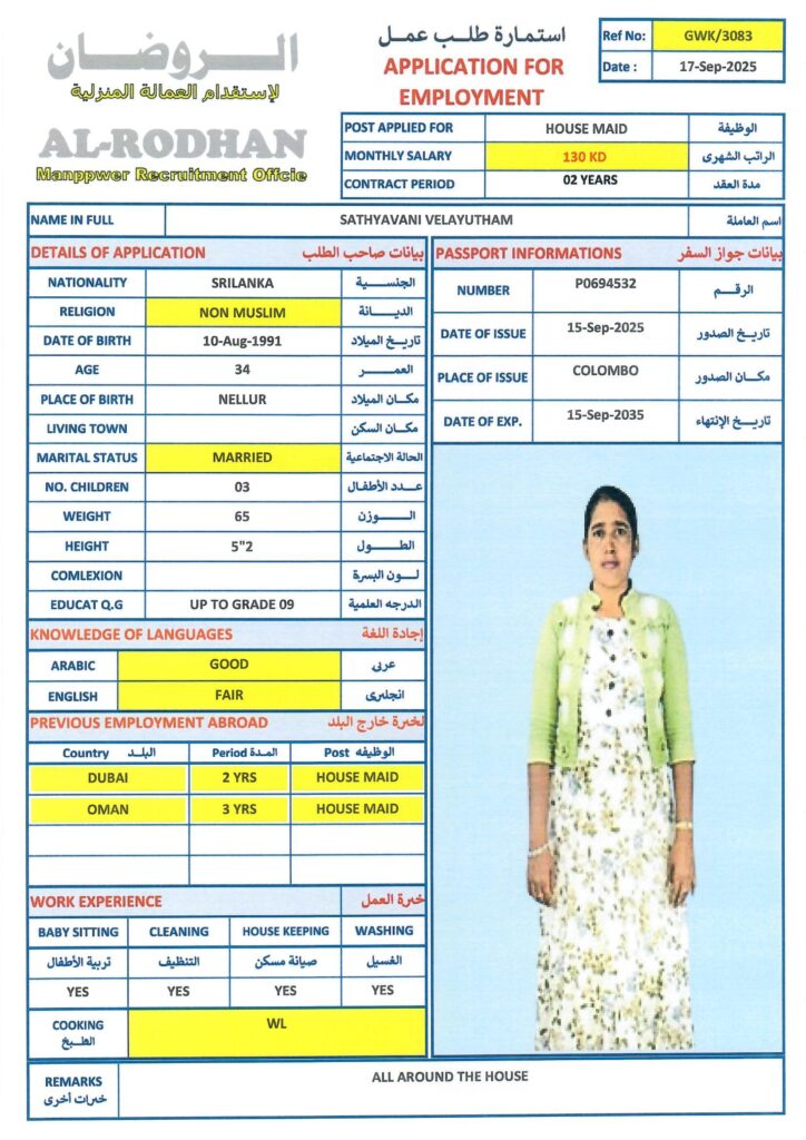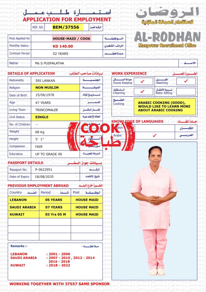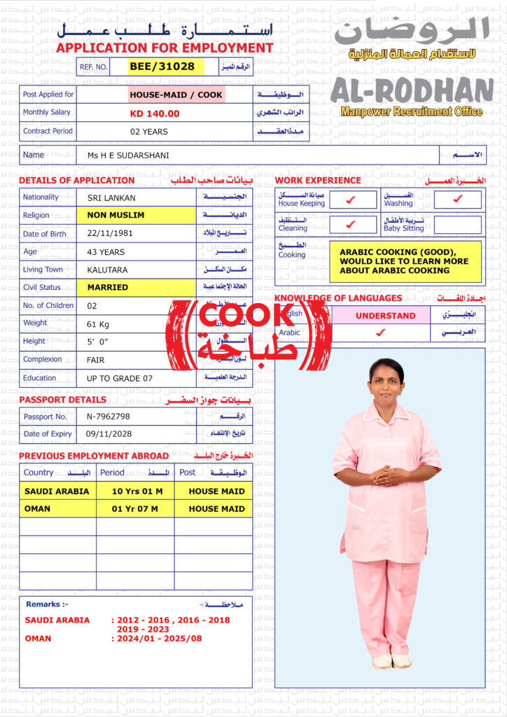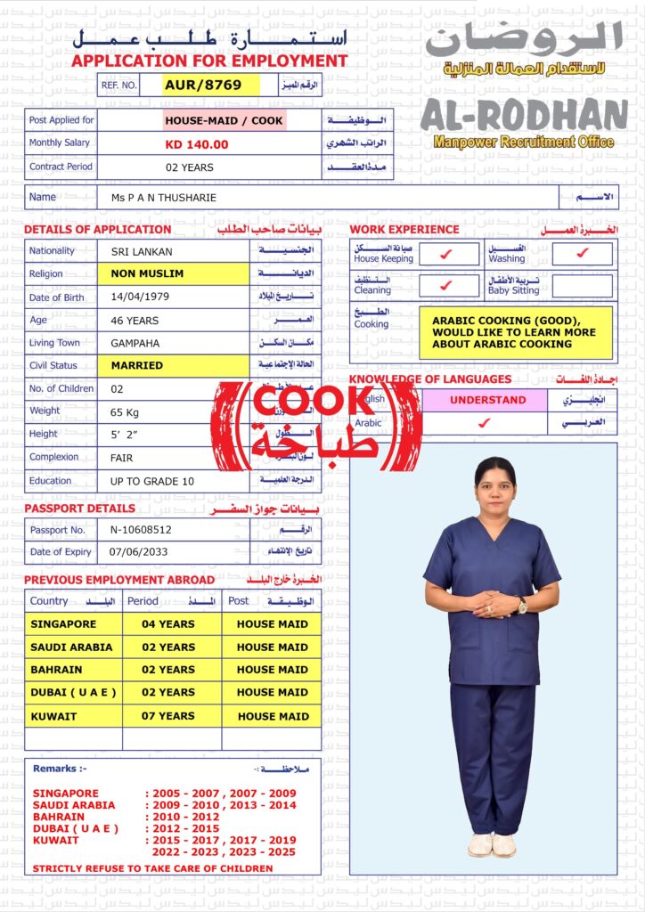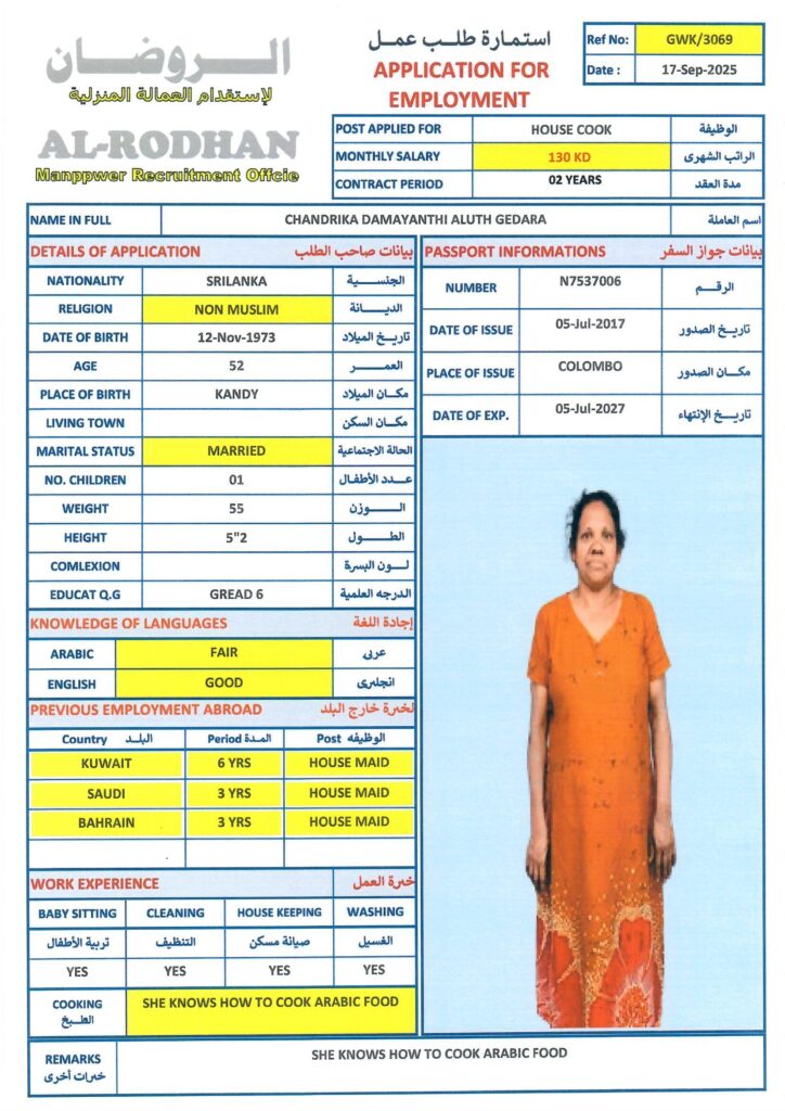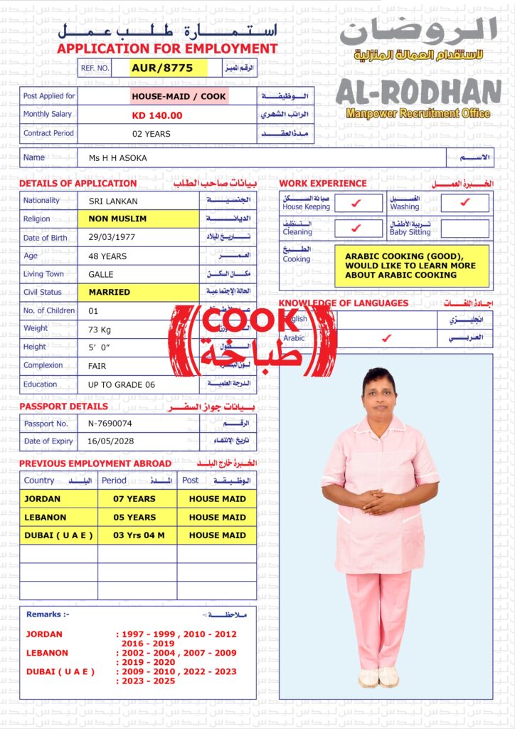 40-52, non-muslim, أنثى, التوفر, سيلان, طباخات, عاملة منزل, متوفر