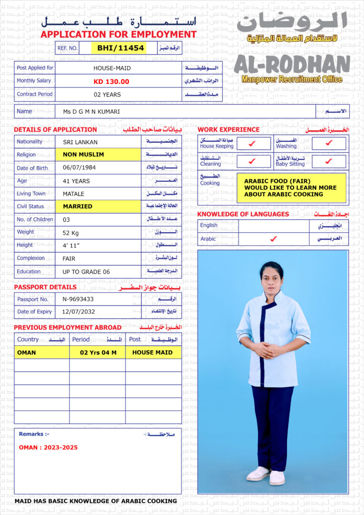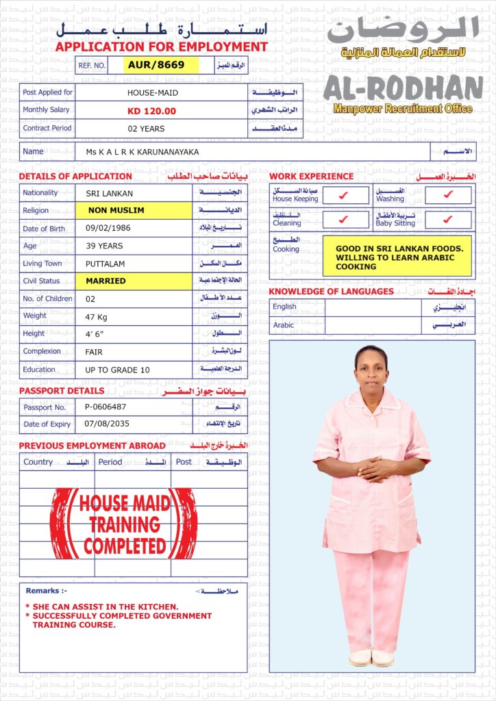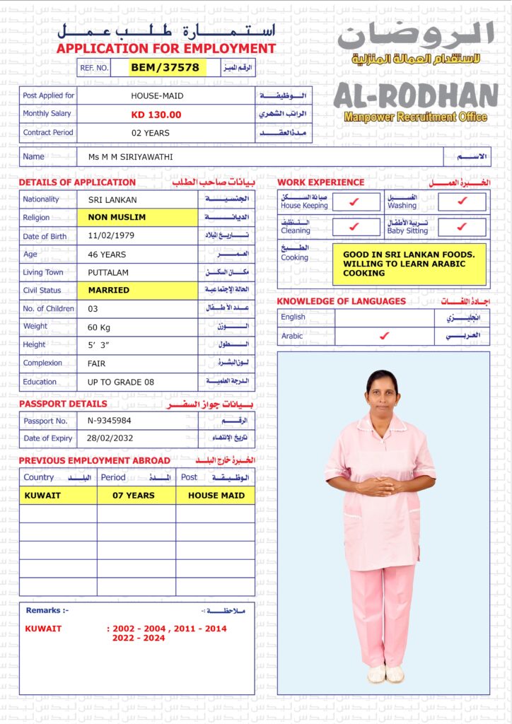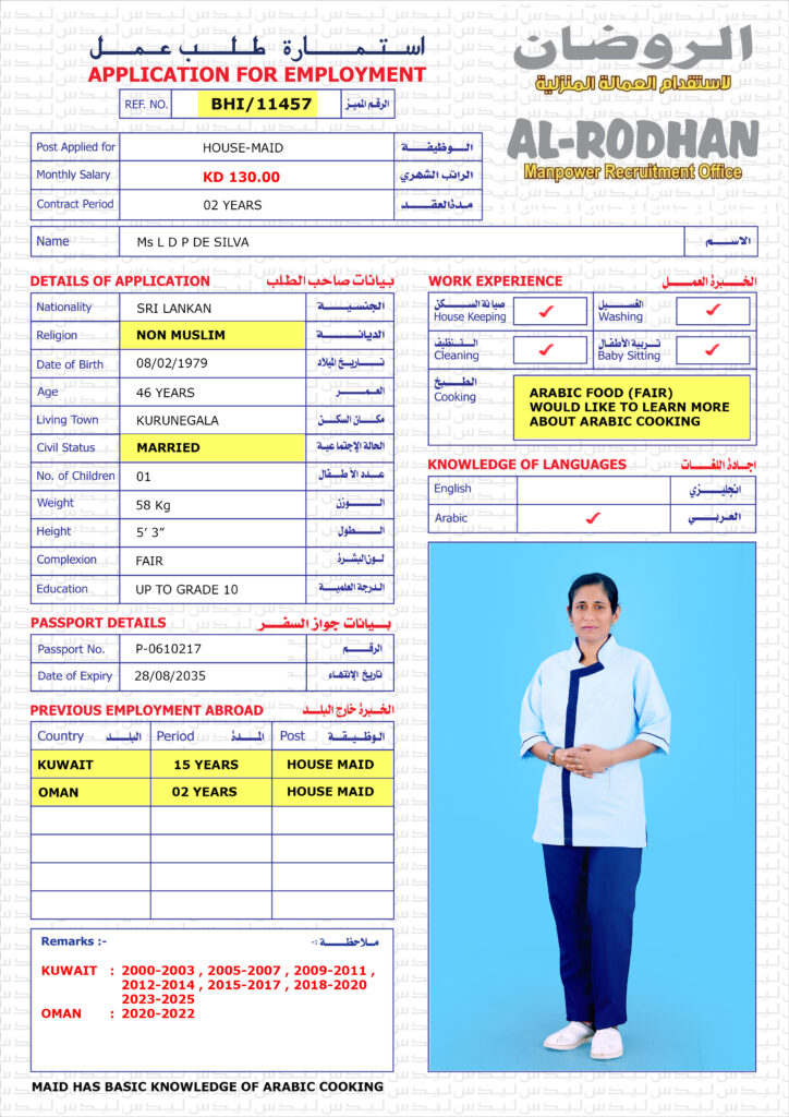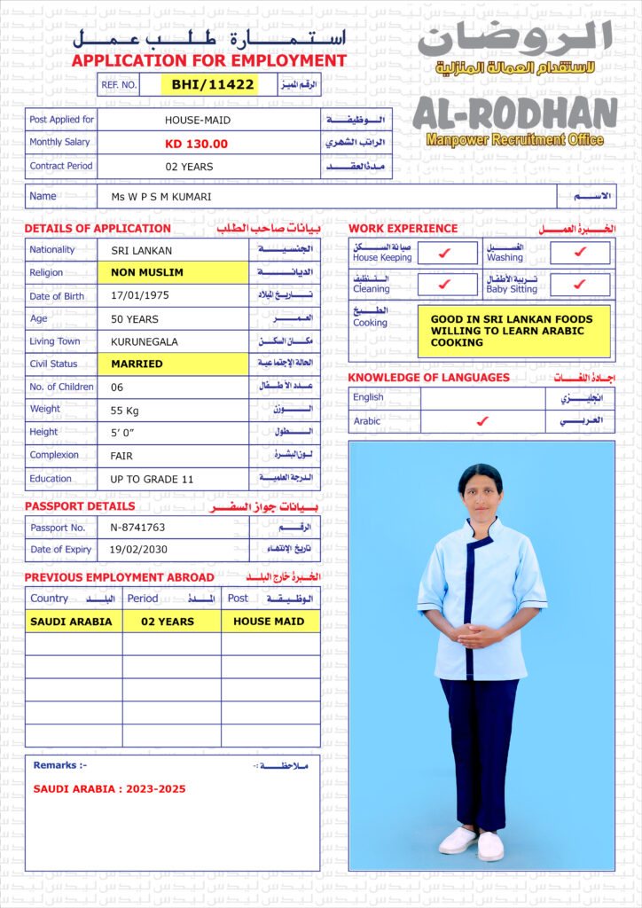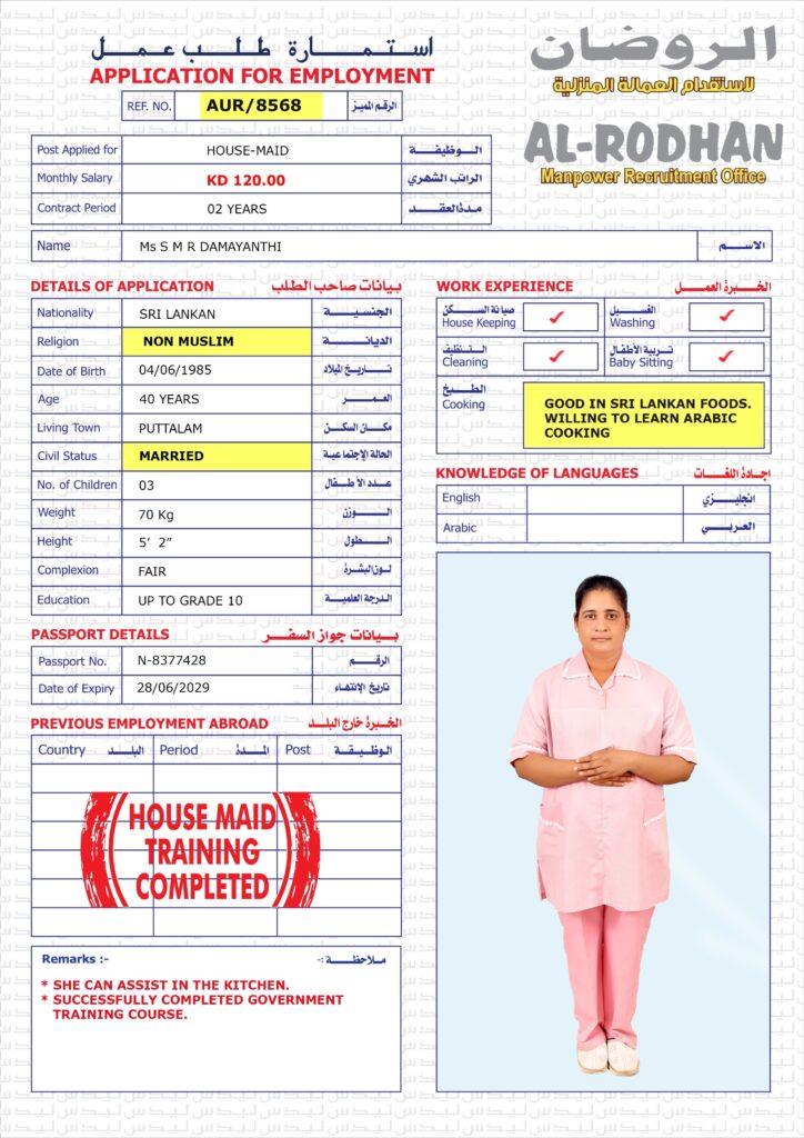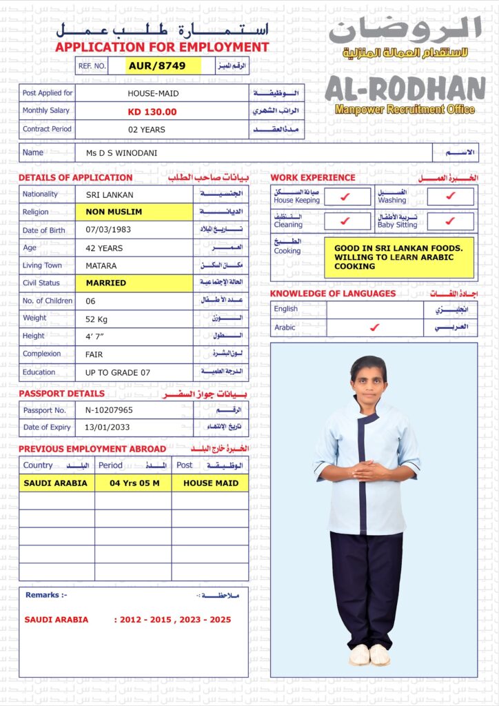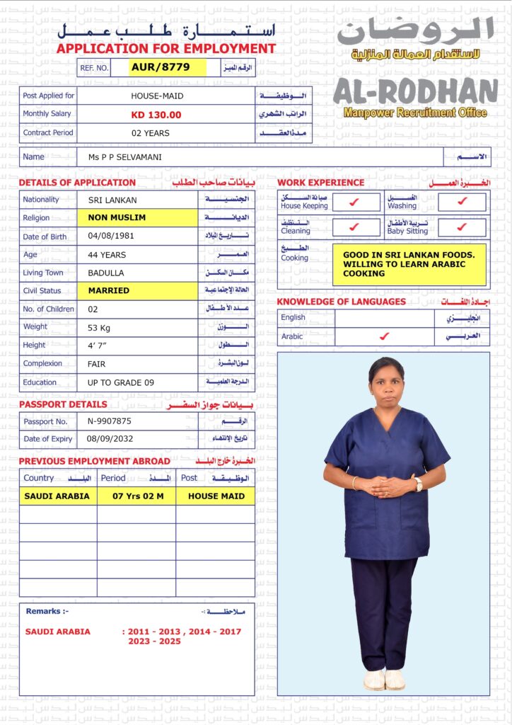 40-52, non-muslim, أنثى, التوفر, سيلان, طباخات, عاملة منزل, متوفر
