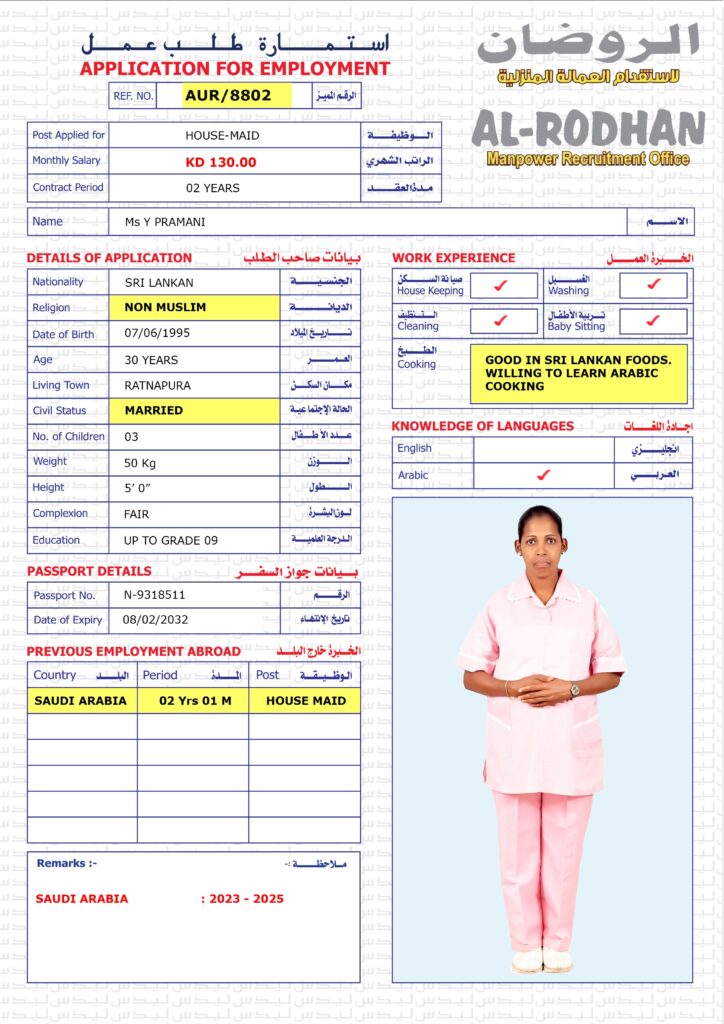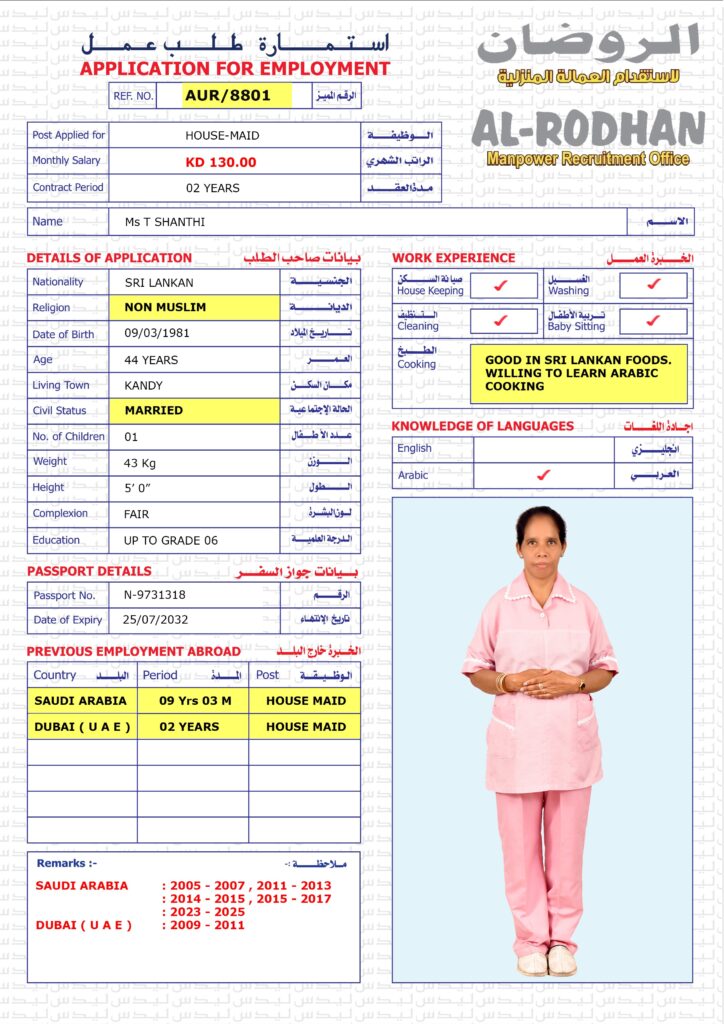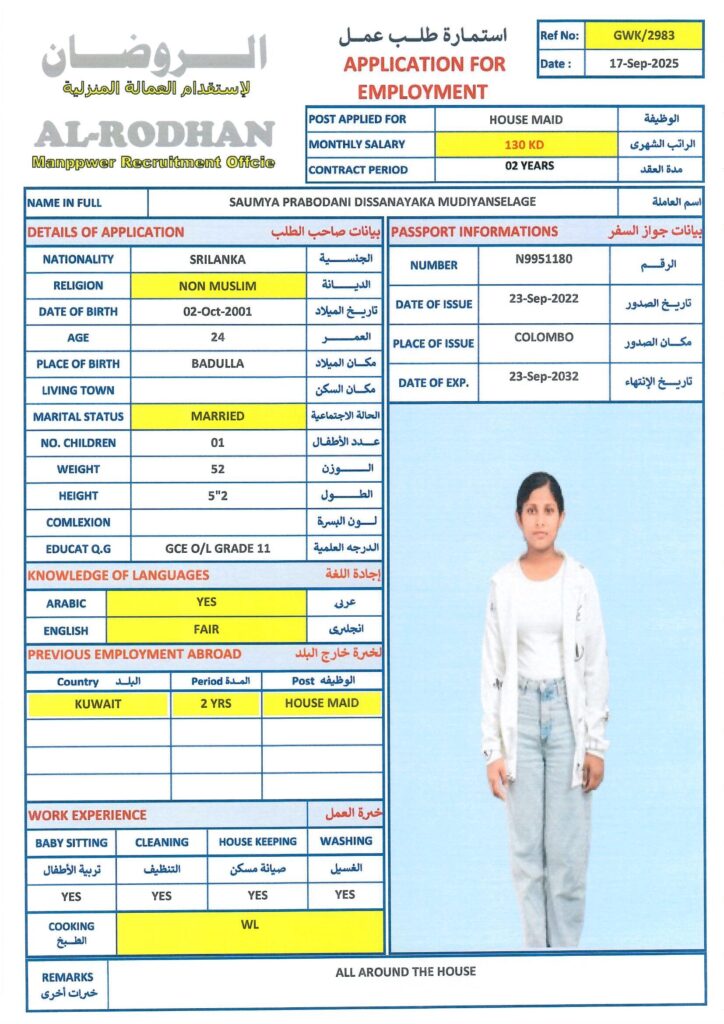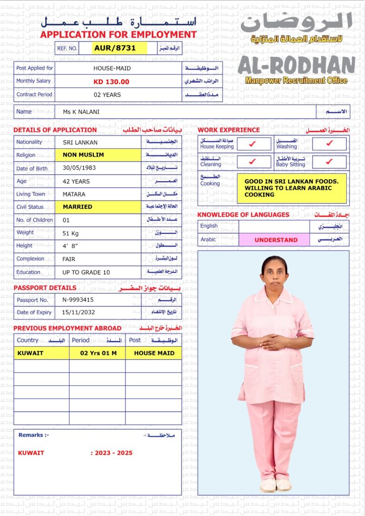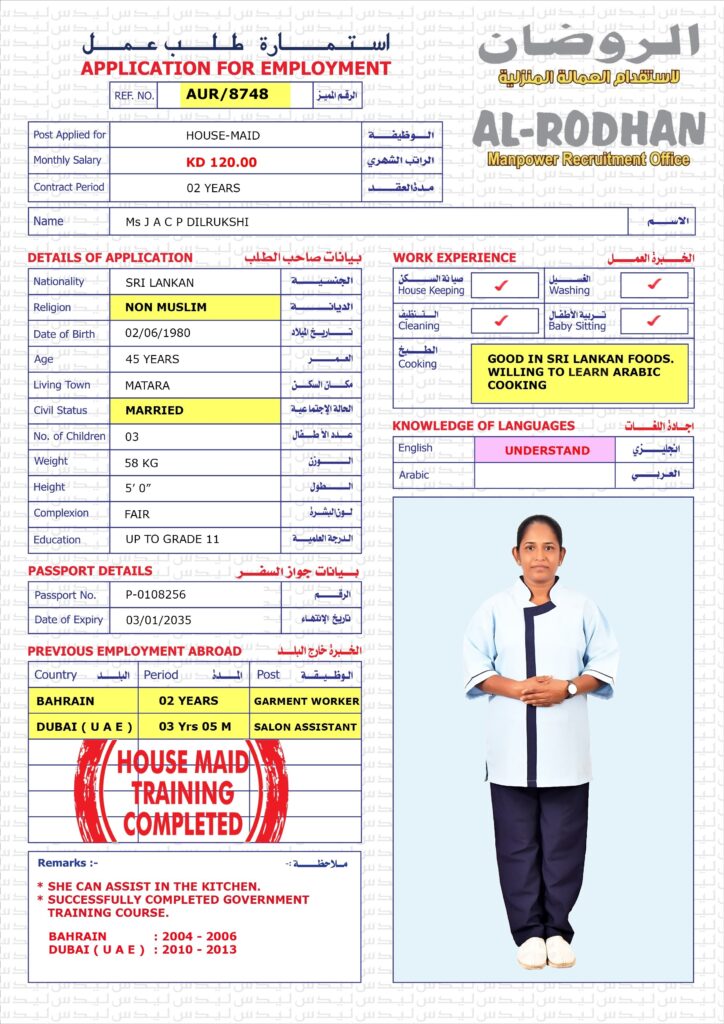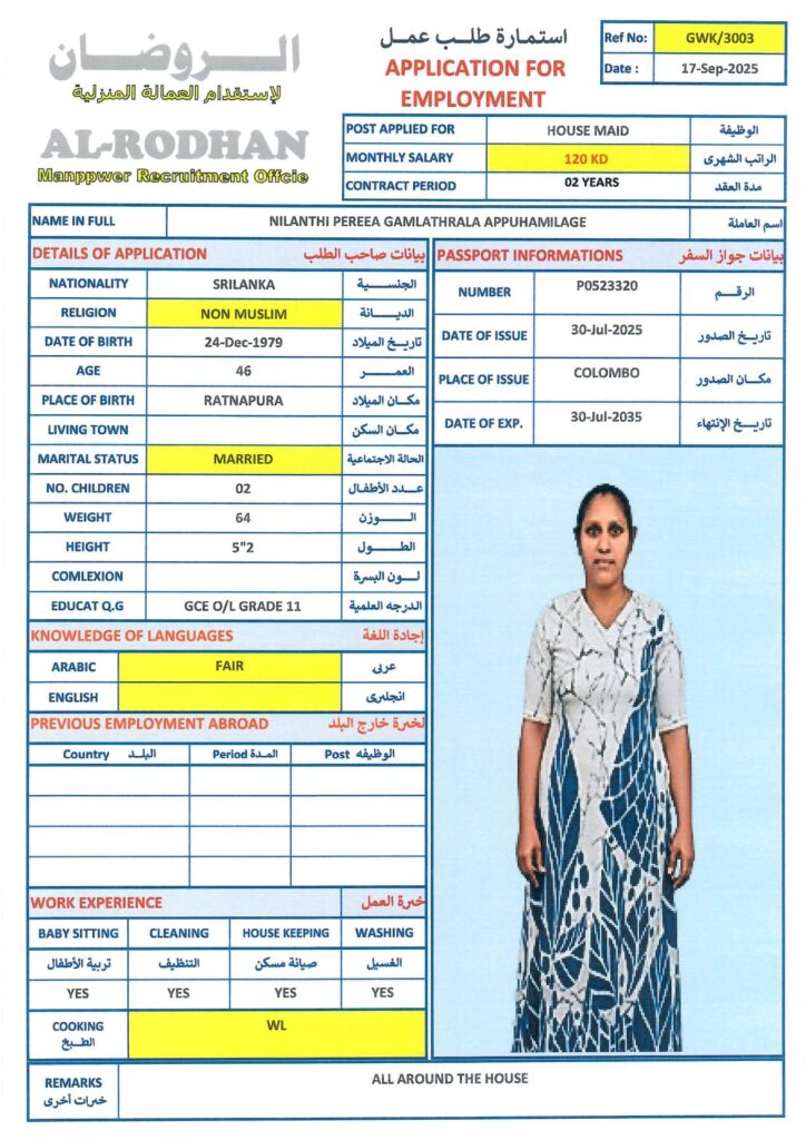 40-52, أنثى, التوفر, سيلان, طباخات, عاملة منزل, متوفر