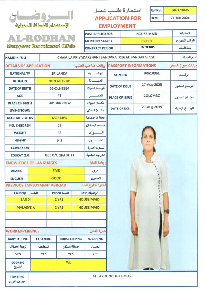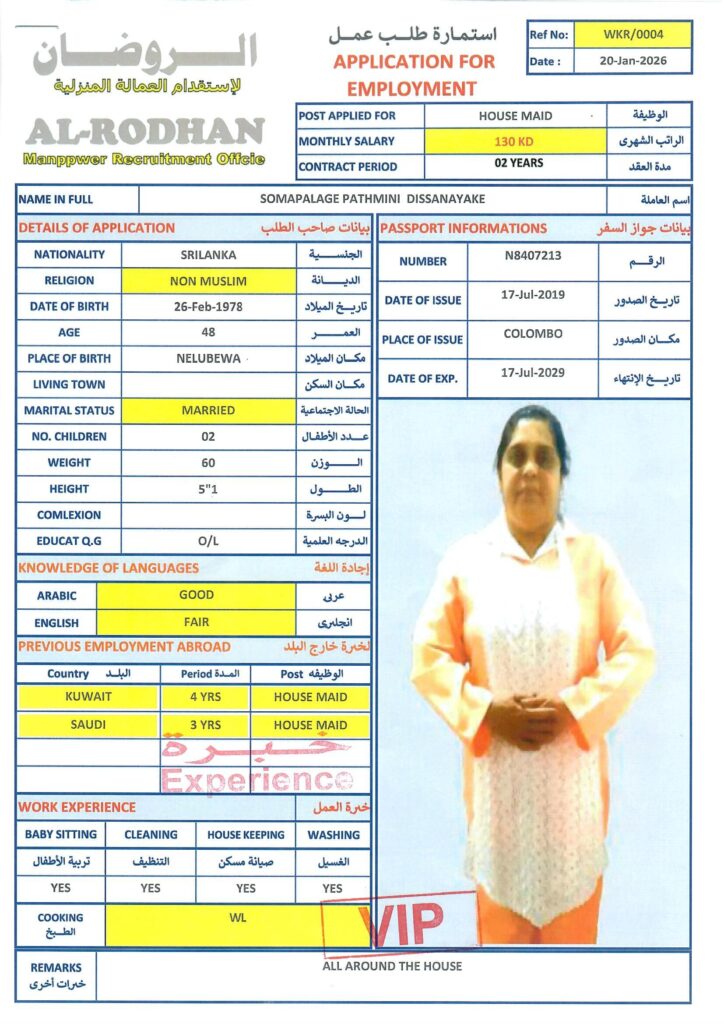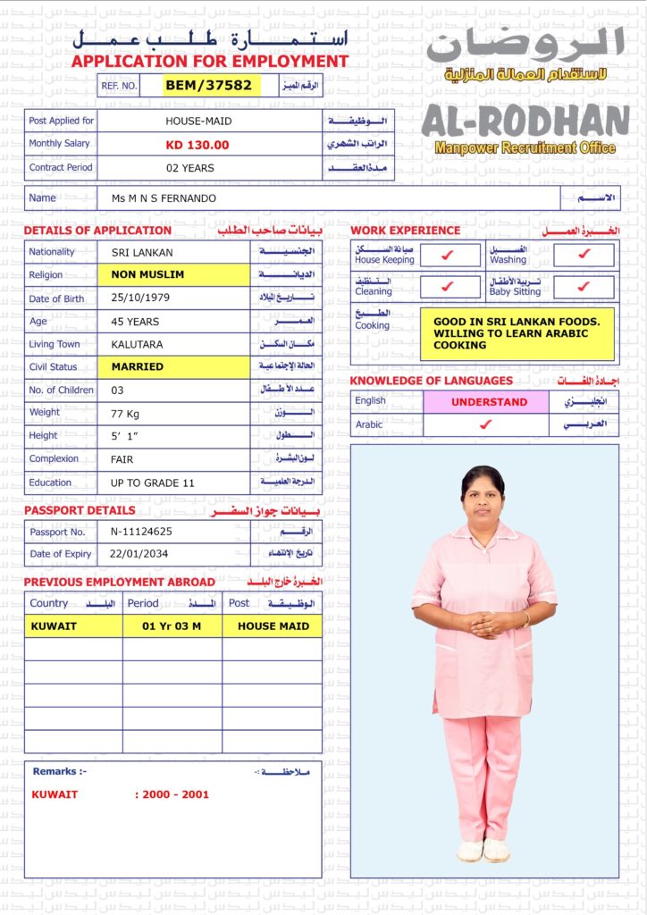 40-52, non-muslim, أنثى, التوفر, سيلان, عاملة منزل, متوفر