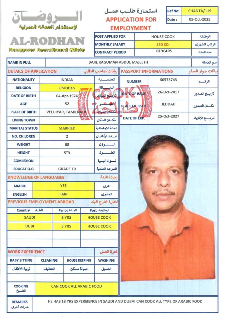 40-52, non-muslim, التوفر, ذكر, طباخات, متوفر, هند