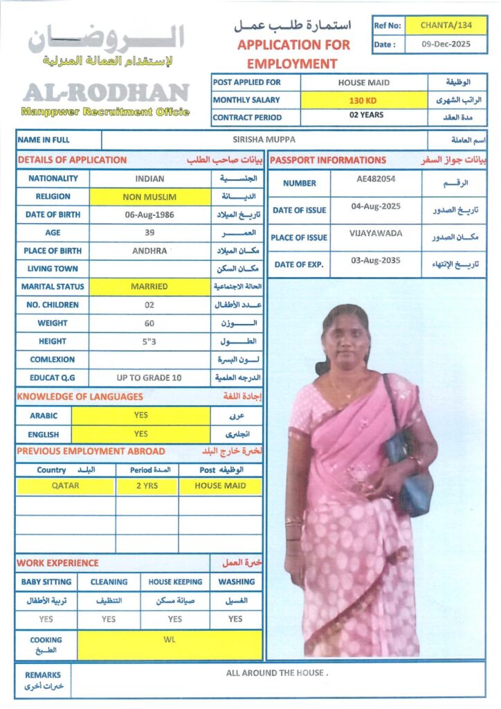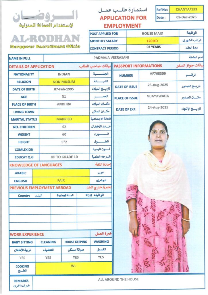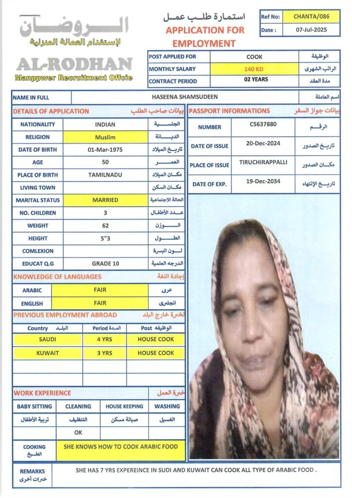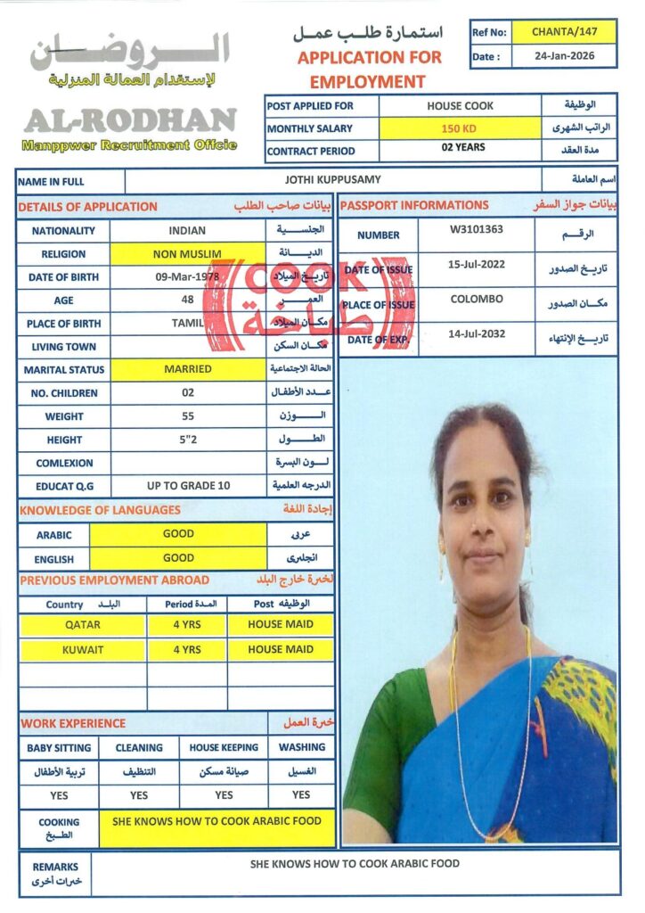 40-52, non-muslim, أنثى, التوفر, طباخات, عاملة منزل, متوفر, هند